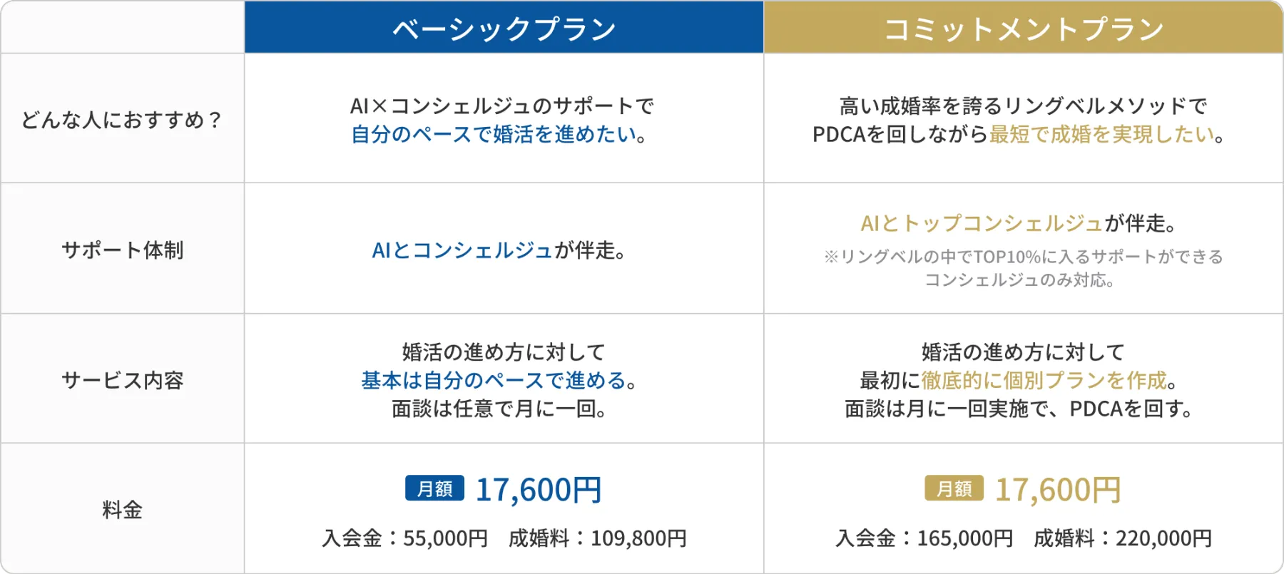 自分のペースで進めるプランと、短期間でトップコンシェルジュと成婚を目指すプランが選べます