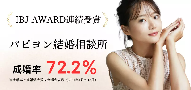 パピヨン結婚相談所は、女性の悩みに寄り添う伴走と、心理学・コミュニケーションの知見に基づく指導で、活動の「理由」も説明しながら進める運用が強み。2024年の成婚率72.2%は「成婚退会者数÷全退会者数」という算定方法が明示されており、指標の読み方が分かりやすい点も好印象です。拠点は昭和町西条、10:00〜19:00、木・日定休。出張面談・オンライン面談にも対応。料金はスタンダードで初期11万円・月1.32万円・成婚24.2万円。丁寧な面談とテーマ別レクチャーで、初対面が苦手な方やトークに不安がある方の改善に注力しています。IBJ AWARD PREMIUM受賞歴もあり、地元で腰を据えて活動したい方に合います。
