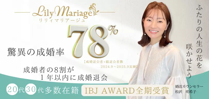リリィマリアージュは仙台市青葉区錦町周辺を拠点に、宮城や福島の20代後半から40代前半のサポートを得意とする結婚相談所です。IBJ AWARD PREMIUMを受賞しており、成婚実績と会員増加の両面で高い評価を受ける優良相談所といえます。