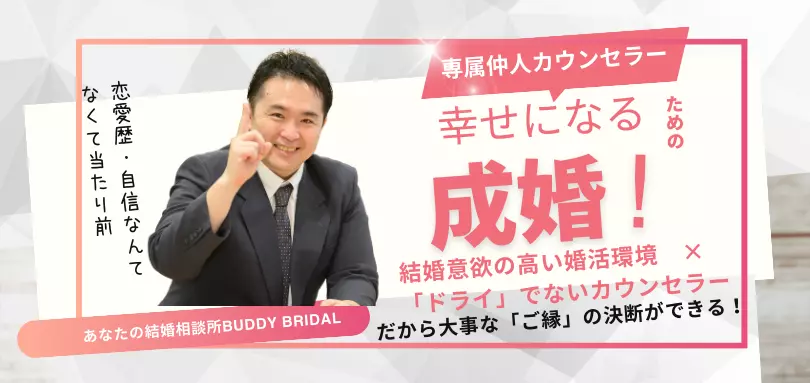 あなたの結婚相談所 BUDDY BRIDAL | データ分析型バディブラサポート | ¥365,200 | 入会時初期費用¥55,000 | ¥13,200 | ¥231,000 | 月200件申し込み可 LINE相談24時間対応 面談も柔軟に実施 | 所沢駅東口徒歩約1分 IBJ AWARD PREMIUM部門4期連続受賞 |
