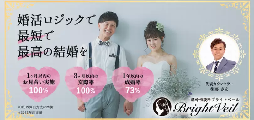 実績 | 完全オンライン型ながら短期成婚事例が多く、メディアのおすすめ結婚相談所特集でもたびたびランクイン。IBJでは口コミ評価平均四点八と高評価を獲得している。 |