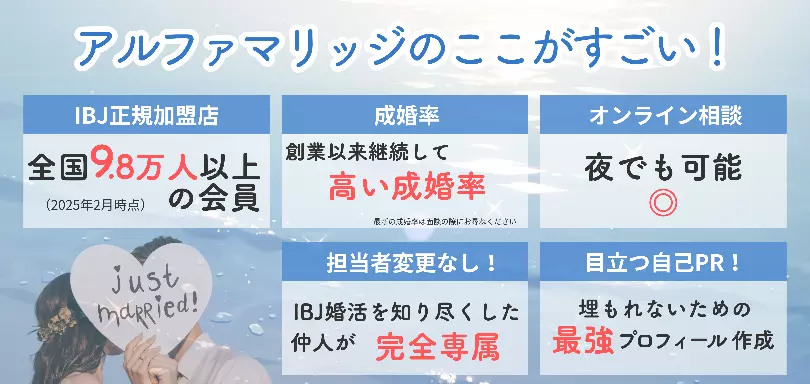 実績 | 完全オンライン型ながら短期成婚事例が多く、メディアのおすすめ結婚相談所特集でもたびたびランクイン。IBJでは口コミ評価平均四点八と高評価を獲得している。 |